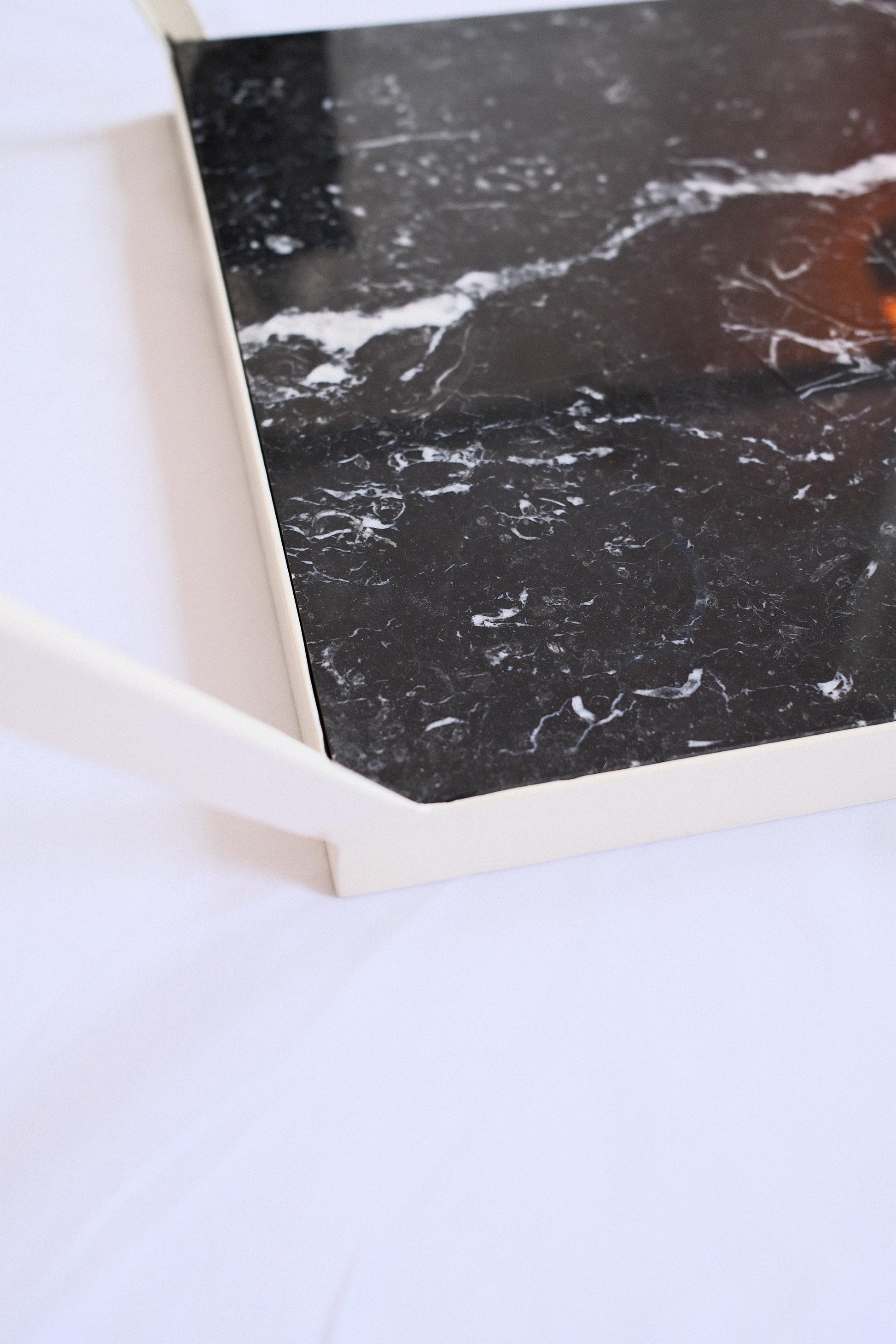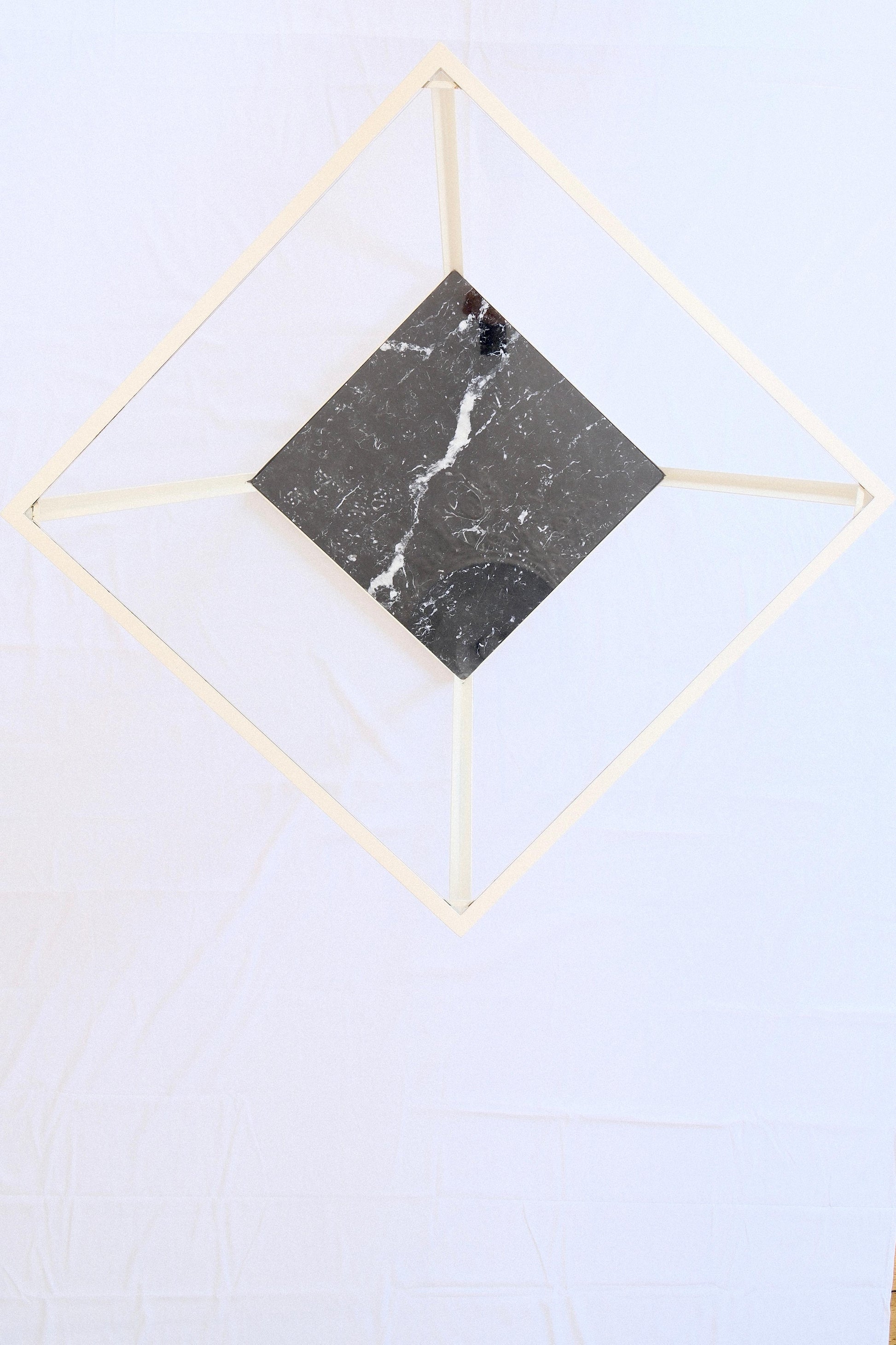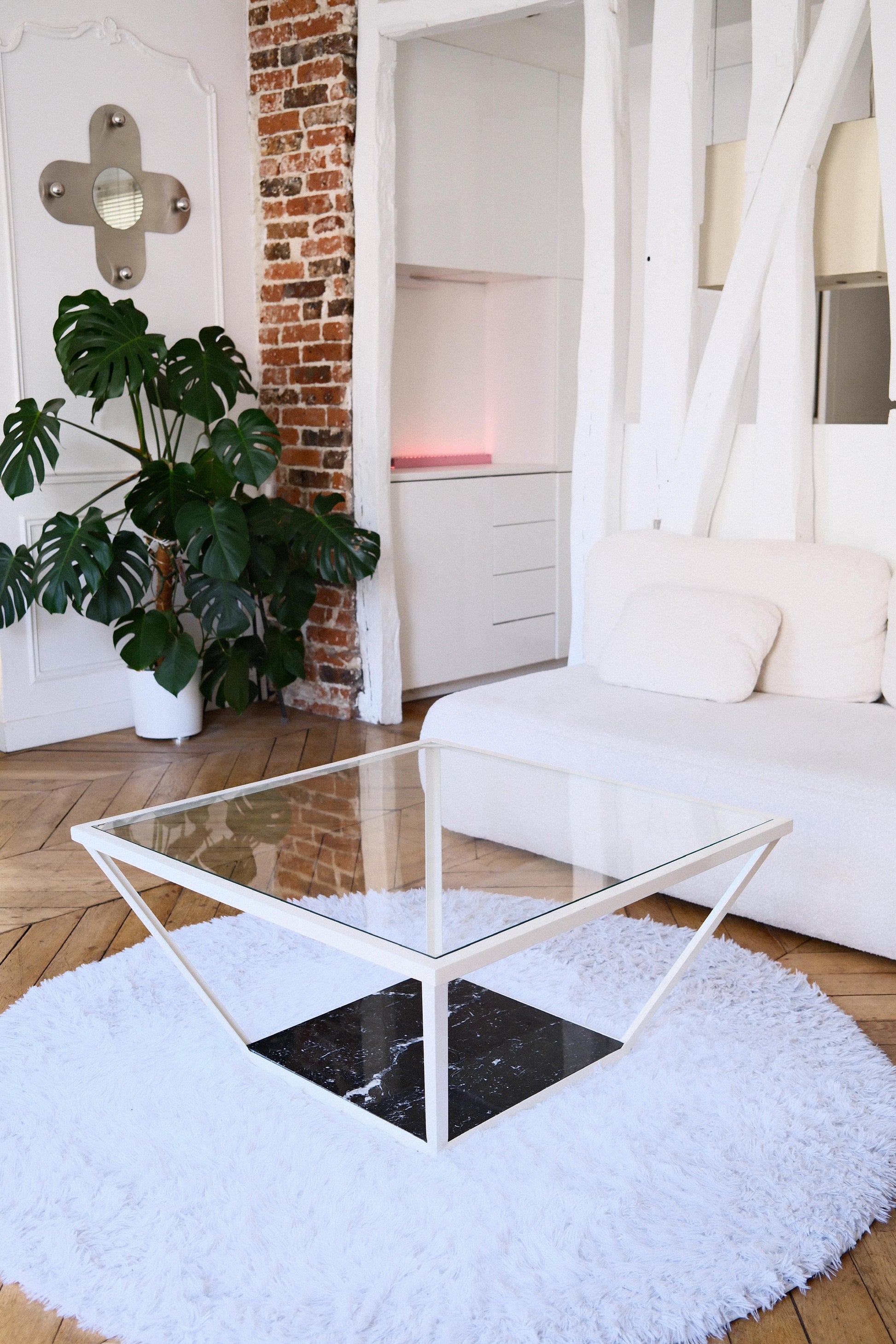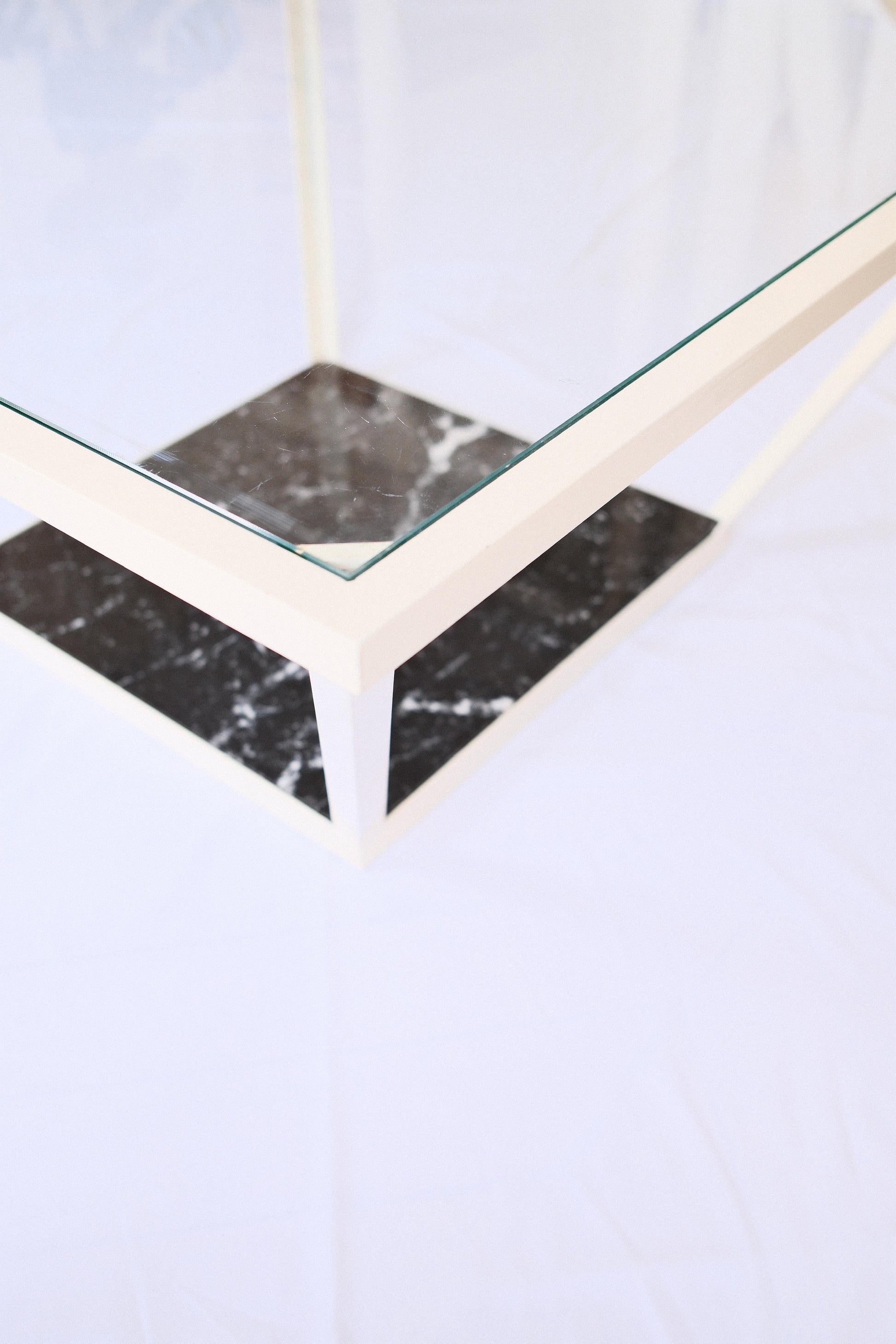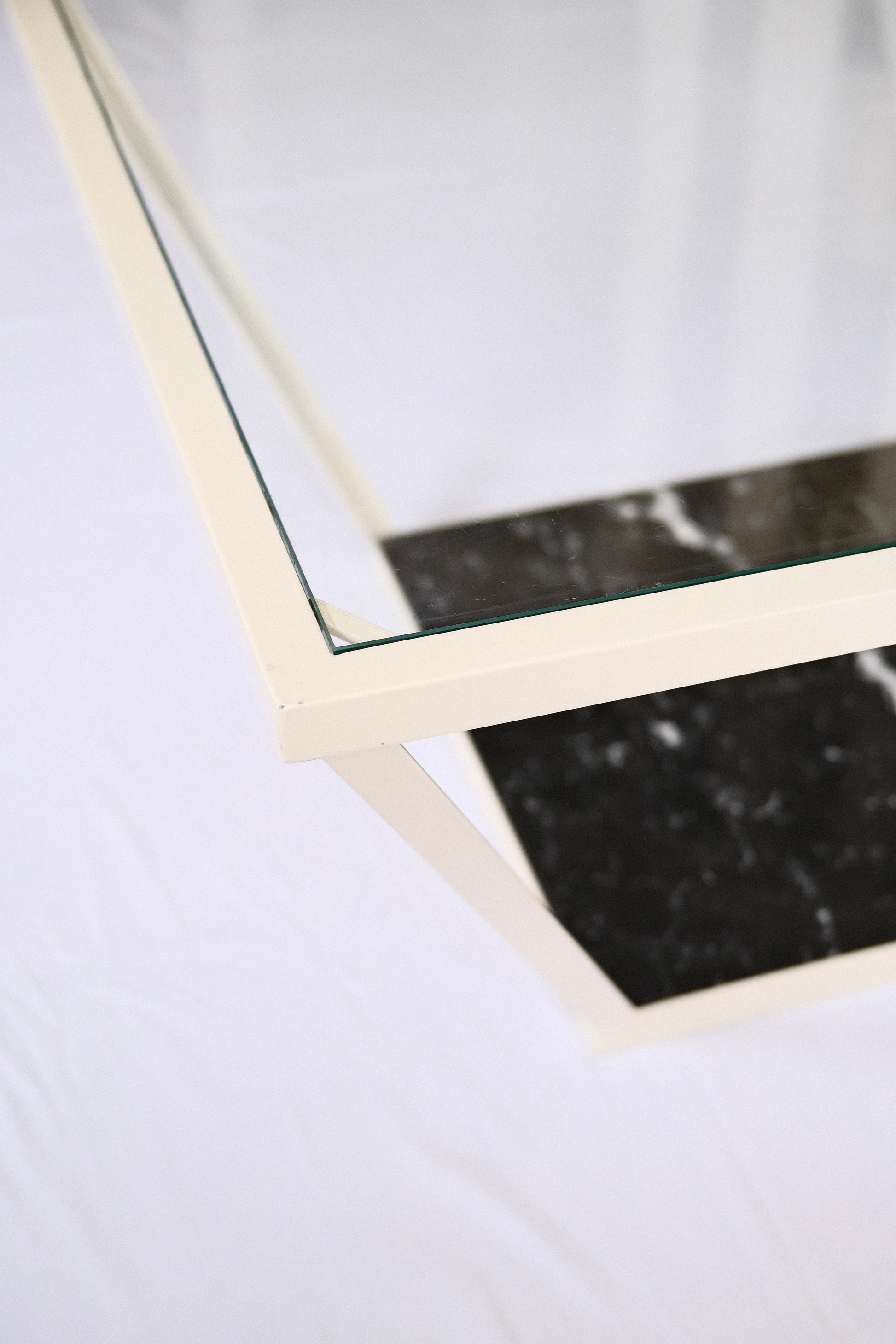 Acier peinture époxy, plateau en marbre et verre trempé.